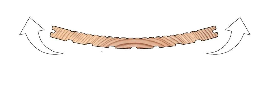 Sibirya ladini deking profilinin enine kesit fotoğrafında gördüğünüz gibi halkalar yüze veya arkaya göre yatay yönlüdür ve ok yönünde ters yönde düzelme eğiliminde kıvrımları vardır; bu da profilin eğilmesine veya marangoz tabiriyle tahtanın "kaymasına" neden olur; görünümü şöyledir: