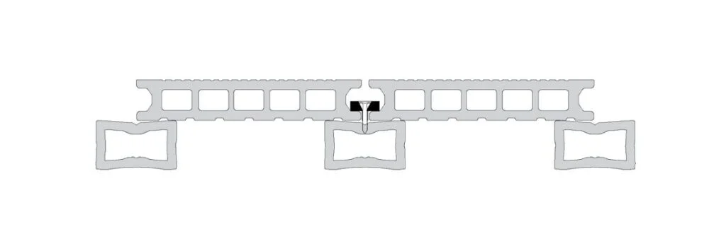 Bu deking platformu kesitinde WPC dekingin klips ve vida ile alt yapıya gizli bağlantı sisteminde nasıl sabitlendiği görülüyor; bu da özel bir estetik sunar; kullanıcılar zemin üzerinde vida başları görünmeyen, zemine yapışmış gibi duran temiz döşeme tahtaları görür – ahşap dekingte en sık rastlanan durumun tersine.