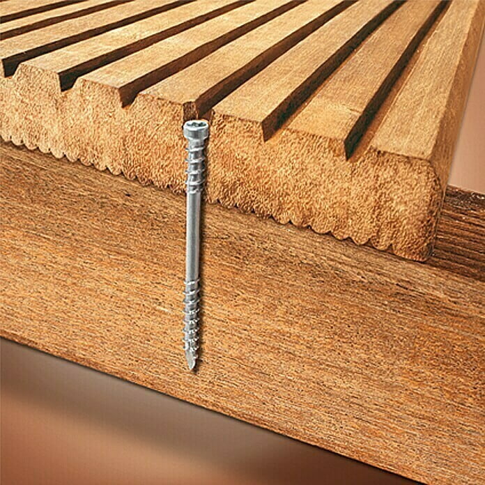 Ahşap deking, vida döşeme tahtasından geçip alt yapıya sabitleyecek şekilde monte edilmelidir. Bu en kaliteli ve en dayanıklı çözümdür. Bu montaj için kısmi dişli paslanmaz vidalar dış koşullarda ahşabın hareketine izin verir.